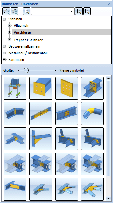 Anschlüsse, Verbindungselemente, Treppen und Geländer sowie vordefinierte Objekte und Baugruppen aus dem Bereich Stahl-/Metallbau lassen sich mit den Funktionen des Andockfensters Bauwesen-Funktionen einbauen.