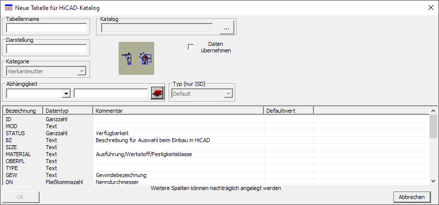 3. Das Dialogfenster Neue Tabelle für HiCAD-Dialog wird angezeigt.