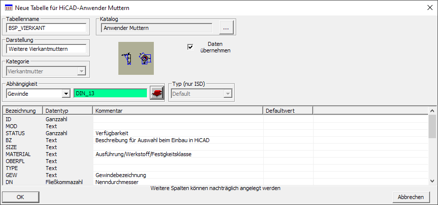 Nach einem Klick auf OK, wird eine Kopie der Tabellendatei DIN_557.IPT (HiCAD Verzeichnis KATALOGE > VERBINDUNGSELEMENTE) erzeugt mit Übernahme aller Daten. Die Kopie wird unter dem Namen BSP_VIERKANT.IPT im HiCAD Verzeichnis KATALOGE > WERKSNORMEN gespeichert.