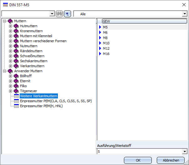 1. Wählen Sie die Tabelle aus, die Sie kopieren wollen, z. B. die Tabelle Verbindungselemente > Muttern > Vierkantmuttern > DIN 557.