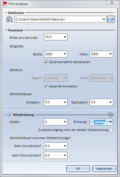 - Durch Aktivieren der Checkbox Wiederholung sind weitere Optionen verfügbar. Hier können Sie festlegen, wie oft der Aufzeichnungszeitraum im Film durchlaufen wird. Dabei stehen folgende Laufrichtungen zur Verfügung: