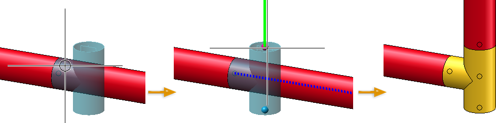 Nach der Bestimmung des Zielpunktes ist es ggf. erforderlich, eine dynamische Verlaufsänderung durchzuführen - beispielsweise, wenn ein Anschluss zwischen zwei Bauteilen gewählt wurde. Dabei versucht HiCAD, das Ziel der Verlaufsänderung selbstständig zu bestimmen.