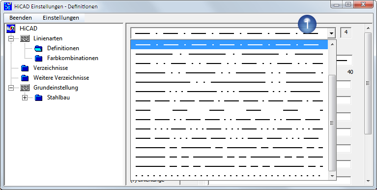 Im Unterordner Definitionen lassen sich die Linienarten ändern. Diese bestimmen die Darstellung von Linien und Kanten, z. B. durchgezogen, gestrichelt, strichpunktiert etc. Neun verschiedene Linienarten sind in HiCAD vordefiniert und können hier - mit Ausnahme der Linienarten 1 bis 4 - geändert werden.