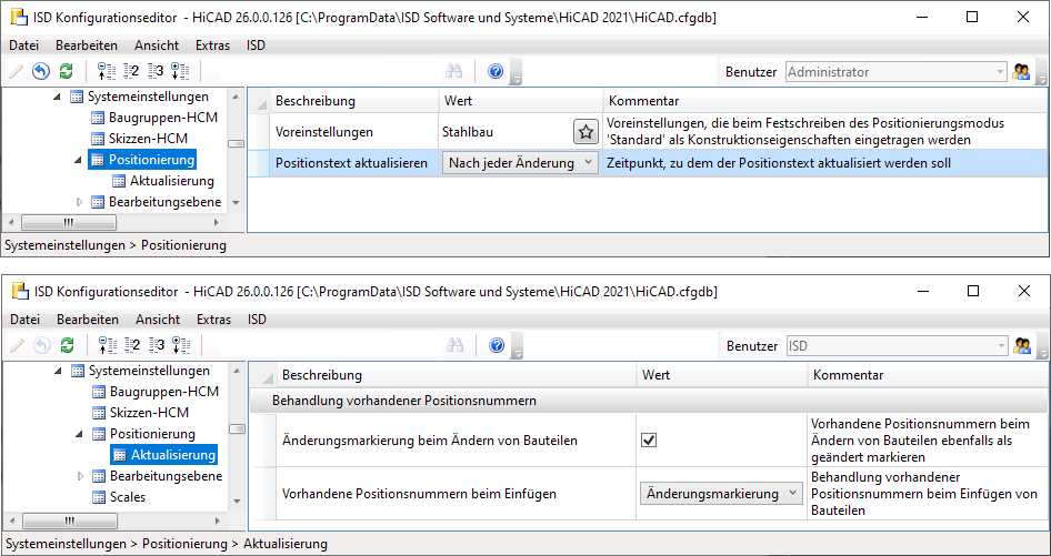 Die Einstellungen unter Kompatibilität > Positionierung bis HiCAD 2017 > Aktualisierung gelten auch für die Standard-Positionierung!