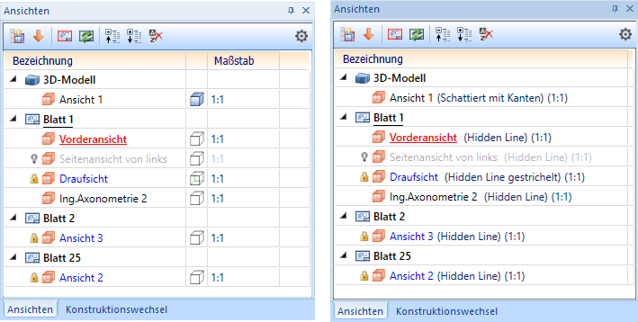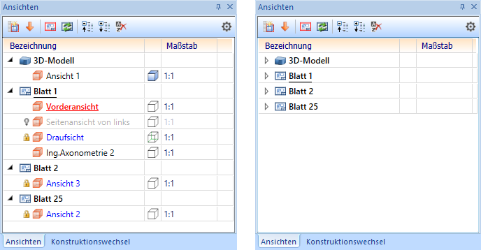 Für jede Ansicht wird ein Symbol für den jeweiligen Ansichtstyp angezeigt sowie der Ansichtsname. Ist in den Einstellungen die mehrspaltige Struktur aktiv, dann werden außerdem ein Symbol für den Darstellungsmodus sowie der Maßstab der Ansicht angezeigt. Die aktive Ansicht wird immer in roter Schrift und unterstrichen dargestellt,