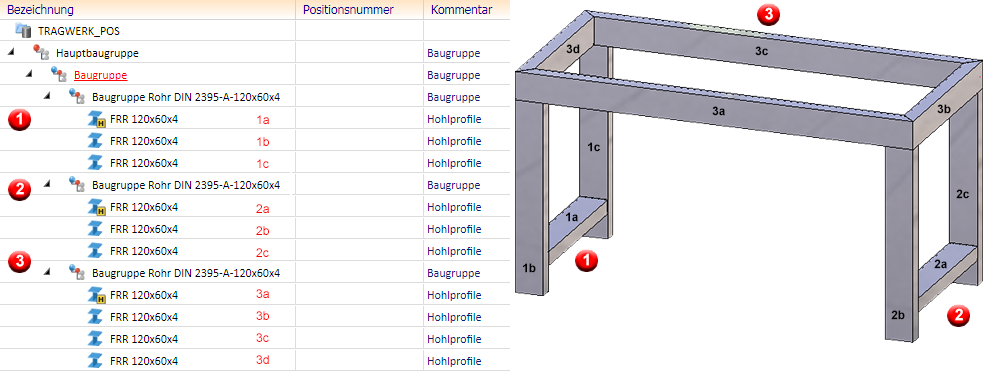 Die abgebildete Stahlbaukonstruktion besteht aus drei Baugruppen, die wiederum aus Hohlprofilen des gleichen Typs bestehen. Die Baugruppen 1 und 2 sind gleich und in diesen Baugruppen die Teile 1b, 1c, 2b und 2c. Baugruppe 3 besteht aus vier Profilen, wobei jeweils zwei der Profile gleich sind und zwar 3a und 3c sowie 3b und 3d.
