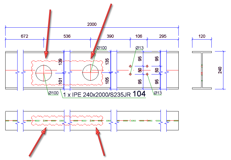 Da in der Konfiguration die Einstellung Revisionswolken erzeugen - in der Vorderansicht und der Draufsicht voreingestellt ist, , werden die Änderungen in den Fertigungszeichnungen durch Revisionswolken gekennzeichnet, z. B.