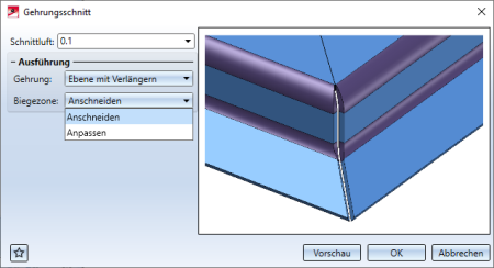 Gehrung: Ebene mit Verlängern Biegezone: Anschneiden |