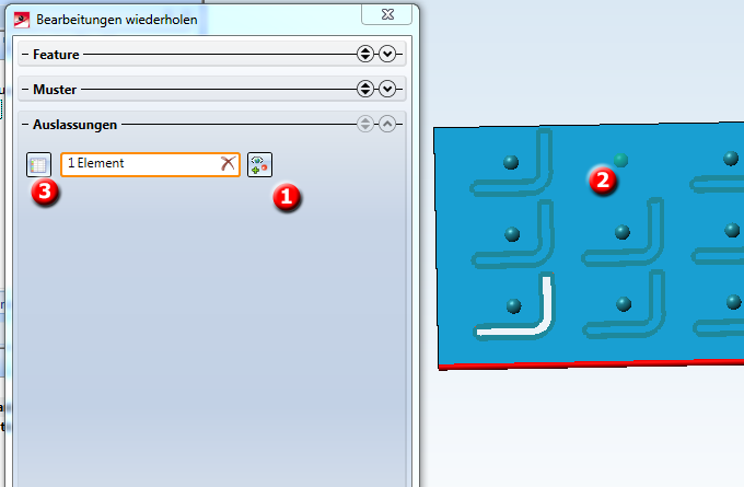 (1) Hier werden die Features des aktuellen Bauteils aufgelistet. Über die Kontrollkästchen vor den Features können Sie auswählen, welche Features wiederholt werden sollen. Ist ein Feature ausgegraut, so kann dieses Feature nicht wiederholt werden. Ist ein Feature blau hinterlegt, muss erst eine Feature-Neuberechnung durchgeführt werden, bevor dieses Feature wiederholt werden kann.