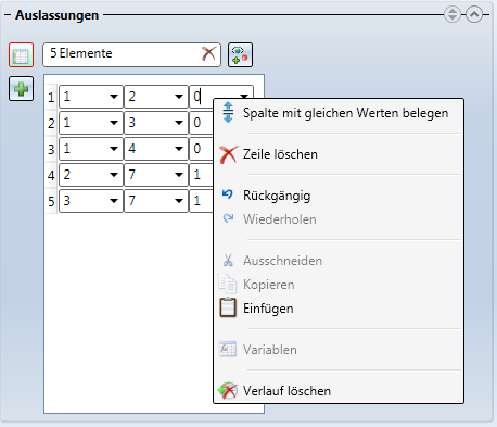 Das Kontextmenü, das bei einem Klick mit der rechten Maustaste auf einen Eintrag der Tabelle erscheint, bietet neben den üblichen Funktionen wie Rückgängig oder Kopieren / Einfügen noch weitere Funktionen:
