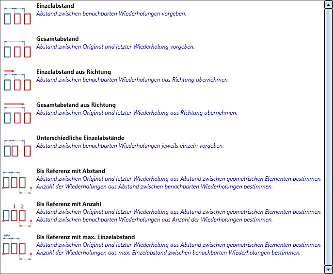 - Bis Referenz mit max. Einzelabstand: Die Wiederholungen werden so entlang der Referenzlänge verteilt, dass ein angegebener Maximalabstand nicht überschritten wird. Der Abstand zwischen zwei Wiederholungen kann somit nicht größer, durchaus aber kleiner als der Maximalabstand sein. Es werden so wenig Wiederholungen wie möglich durchgeführt.