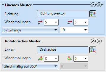- Werden bei einem linearen Muster die Optionen Einzelabstand aus Richtung oder Gesamtabstand aus Richtung gewählt, wird die Länge des Richtungsvektors im Feld Länge angezeigt. Dieser Wert kann dann nicht geändert werden und wird zur Verdeutlichung gelb hinterlegt.