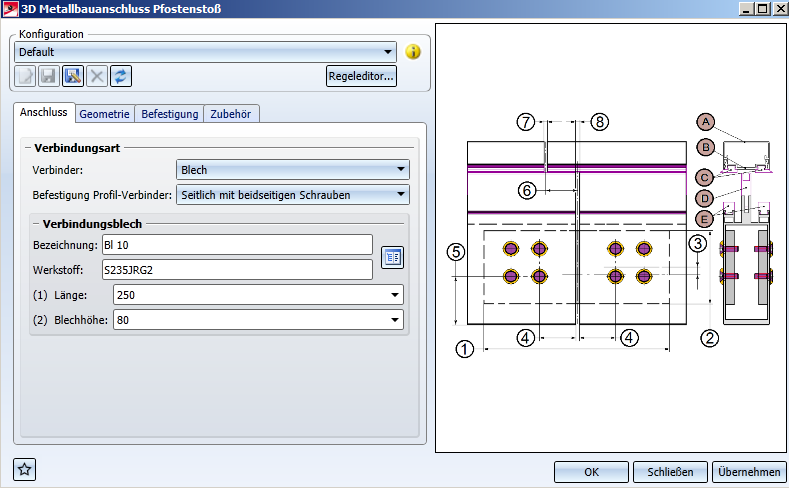 Unter Anschluss können Sie auswählen, ob die Befestigung Profil-Verbinder