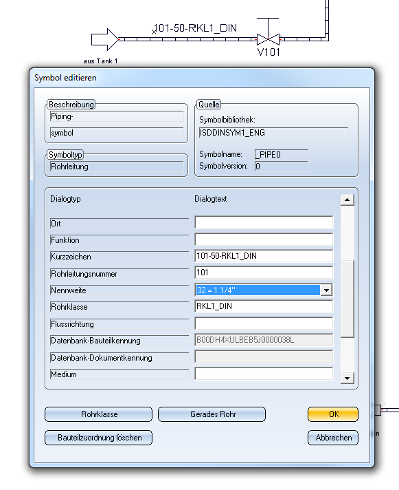 Der Dialog zum Editieren eines Rohrleitungssymbols sieht, wenn dem Symbol eine Rohrklasse zugeordnet ist, wie folgt aus: