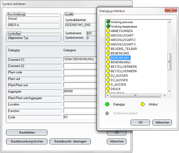 Angenommen der Inhalt des Datenbank-Attributes BENENNUNG soll in den ersten Kommentar-Dialog eines Behälter-Symbols übernommen werden. Dann muss dort folgender Dialogtext stehen: