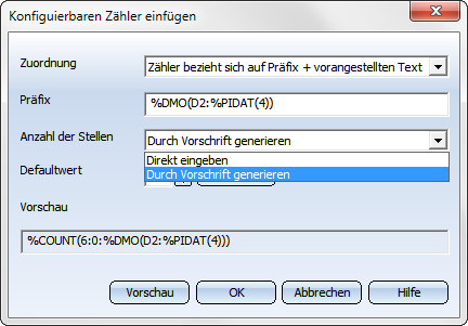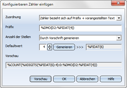 Nach der Bestätigung mit OK wird der Generierungsausdruck mit Zähler z.B. %COUNT(6:0:%DMO(D2:%PIDAT(4))) im Eingabefeld des Dialogtextes angezeigt.