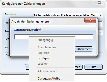 Referenz-Text, Präfix-Text, Digits: Siehe oben die Syntax von %COUNT(…). In Kontext-Menü von Referenz-Text oder Präfix-Text ist der Eintrag Dialogtyp/Attribut zu finden: