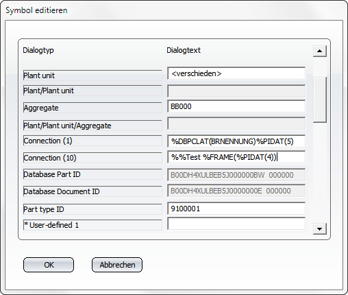 Geben Sie den Verweis, wie oben gezeigt, in die Spalte Default-Dialogtext des entsprechenden Dialogtyps ein. Sie können dem Verweis einen Text voranstellen (hier DB-Attribute) damit Sie in der Grafik des Symbols bereits am Textplatzhalter erkennen können, dass dort ein Attributwert übernommen werden soll. Bei der Auswertung des Verweises im R+I-Schema wird dieser vorangestellte Text gelöscht.