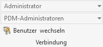 Dort werden der aktuell angemeldete Benutzer und die aktive Benutzergruppe angezeigt (im Beispiel oben der Benutzer "Administrator" und die Gruppe "PDM-Administratoren") .