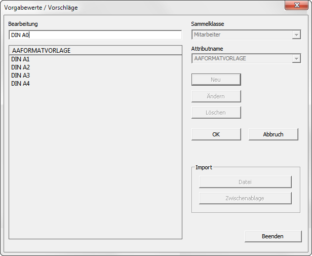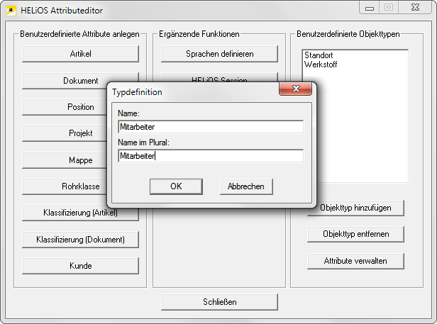 Attribute beziehen sich immer auf einen Objekttyp, d. h. ein Attribut (z. B. Benennung) kann in der Dokument-, Artikel- und Projektmaske mit unterschiedlichen Bedeutungen auftauchen. Sie können also auch für den neuen Objekttyp Mitarbeiter ein neues Attribut Benennung anlegen.