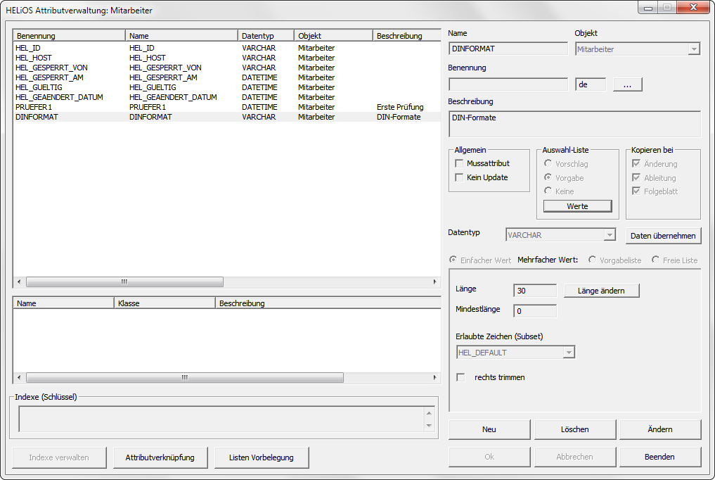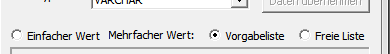 Sie haben beim Definieren von VARCHAR-Attributen die Möglichkeit in der Attributbeschreibung auch sogenannte Listenattribute anzulegen. Dazu müssen Sie beim Anlegen eines neuen Attributs die Optionen Vorgabeliste oder Freie Liste aktivieren.