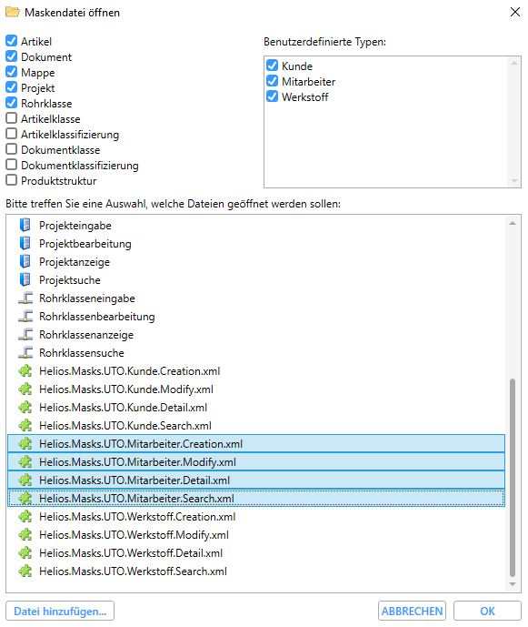 Im Auswahldialog werden Ihnen daraufhin die neuen Masken zum benutzerdefinierten Objekttyp zur Auswahl angeboten: