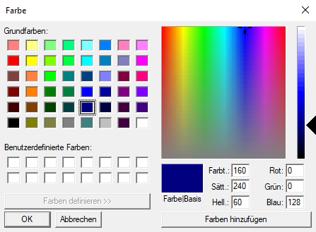 Sie können auf einer der Grundfarben im Fenster klicken oder durch Klick in das Farbfeld rechts einen Farbton auswählen.