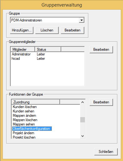 Für alle Oberflächenänderungen, außer dem Speichern der Spaltenbreite, muss dem angemeldete Benutzer in der Benutzerverwaltung (oder über die Gruppenverwaltung) von EDBSETUP die Funktion Oberflächenkonfiguration zugewiesen worden sein. Andernfalls besteht kein Zugriffsrecht um Änderungen der Oberflächenkonfiguration vorzunehmen.