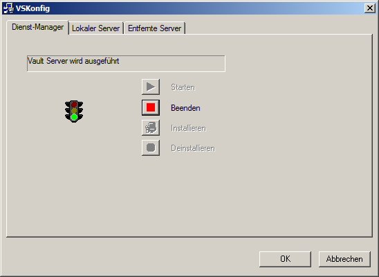 Wurde neue Angaben oder Änderungen gemacht, muss der Vault-Server im Reiter Dienst-Manager mit einem Klick auf Beenden gestoppt und einem weiteren auf Starten wieder ausgeführt werden, damit die Änderungen einbezogen werden.