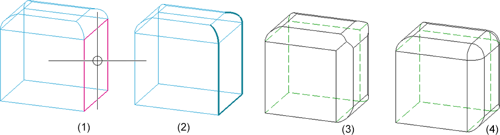 (1) Gewählte Fläche, (2) tangential anschließende Kanten, (3) Runden ohne tangentiale Fortsetzung, (4) Runden mit tangentialer Fortsetzung,