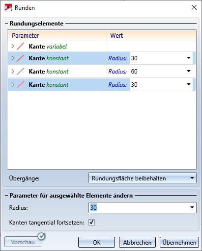 Sollen beim Runden einer Kante automatisch auch alle tangential anschließenden Kanten mit gerundet werden, dann aktivieren Sie die Checkbox Kanten tangential fortsetzen.