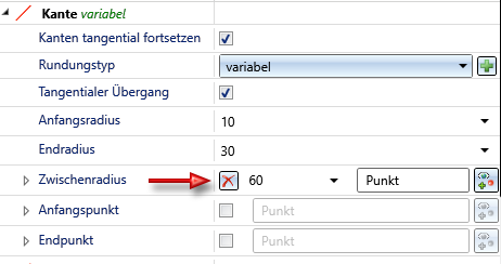 Geben Sie den Radius am Anfang und Ende der Kante ein.