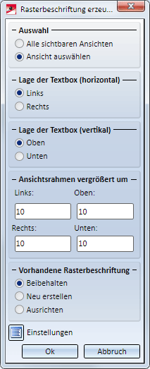 Mit dieser Funktion lassen sich in einem Schritt alle Achsen eines 3D-Rasters (Systemachsen) individuell beschriften. Dazu wird das Dialogfenster Rasterbeschriftung erzeugen angezeigt.