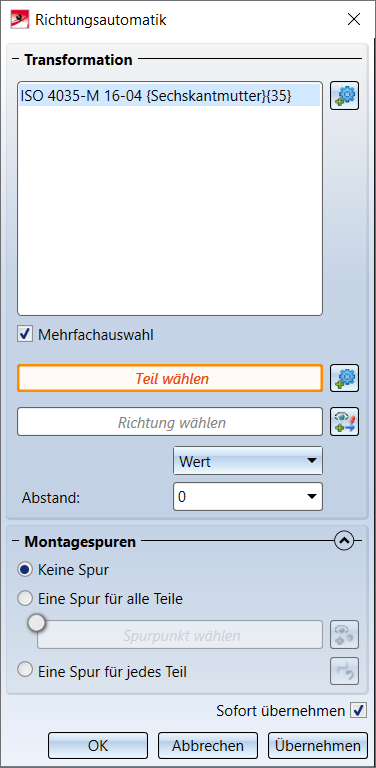 Ist die Checkbox Sofort übernehmen aktiv, dann wird die Transformation sofort - wie in der Vorschau dargestellt - übernommen und in das Explosionsprotokoll eingetragen, d. h. Sie müssen nicht die Schaltfläche Übernehmen anklicken. Werden anschließend sofort - ohne Änderung der anderen Einstellungen - weitere Teile ausgewählt, dann wird die gleiche Transformation sofort für diese Teile ausgeführt, ohne dass die Teile in der Auswahlliste erscheinen.