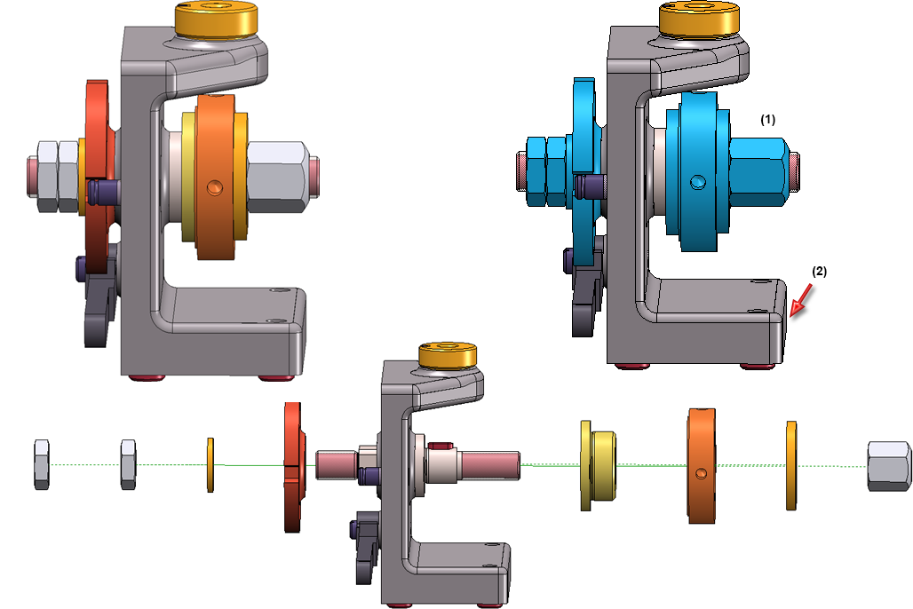 Betrachten wir die in der folgenden Abbildung links dargestellte Ausgangskonstruktion. Wir wollen erreichen, das die ausgewählten - in der Abbildung blau markierten - Teile (1) bezogen auf das Fixteil (2) in einem Schritt beidseitig verschoben werden, je nach ihrer Lage zu Teil (2). Das gewünschte Ergebnis ist unten in der Abbildung dargestellt.