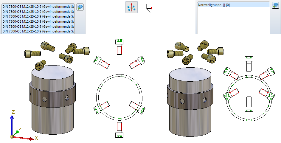 Die nächste Abbildung zeigt eine Explosionsansicht, bei der für die Konzentrik ebenfalls die einzelnen Schrauben ausgewählt. Allerdings wurde hier als Achse die X-Achse gewählt, die in diesem Fall kein sinnvolles Zentrum darstellt.Hätte man hier die Normteilgruppe gewählt, dann entspricht dies einer "normalen" Verschiebung.