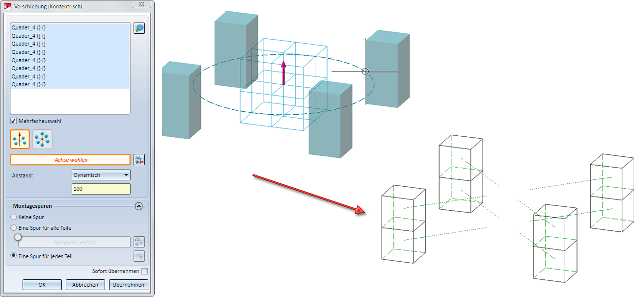Ist die Checkbox Sofort übernehmen aktiv, dann wird die Transformation sofort - wie in der Vorschau dargestellt - übernommen und in das Explosionsprotokoll eingetragen, d. h. Sie müssen nicht die Schaltfläche Übernehmen anklicken. Werden anschließend sofort - ohne Änderung der anderen Einstellungen - weitere Teile ausgewählt, dann wird die gleiche Transformation sofort für diese Teile ausgeführt, ohne dass die Teile in der Auswahlliste erscheinen.