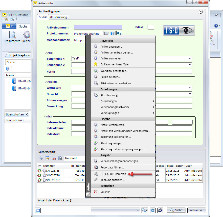 Wenn Sie aber keinen neuen Artikelstamm für diese Ausprägung haben wollen, sondern einen vorhandenen übernehmen wollen, gehen Sie nun im HELiOS-Desktop-Fenster mit Rechtsklick auf den gewünschten Artikelstamm und wählen Sie die Option HELiOS-URL kopieren.