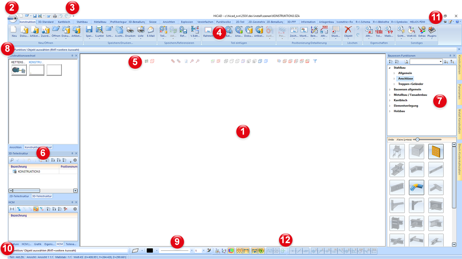 Die Benutzeroberfläche von HiCAD besteht aus folgenden Bereichen: