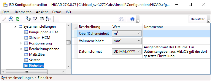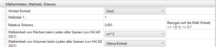 In der Regel werden diese Einstellungen mit den Einstellungen unter Systemeinstellungen > Einheiten übereinstimmen. Das heißt, dass Sie beim Laden von Konstruktionen früherer HiCAD-Versionen nichts ändern müssen.