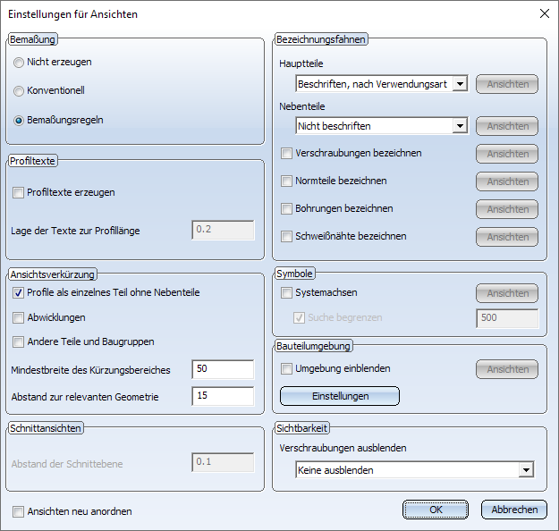Hier legen Sie die Darstellung der Ansichten fest, beispielsweise die Art der Bemaßung, die Ausgabe der Bezeichnungsfahnen, die Darstellung der Bauteilumgebung u. v. m.