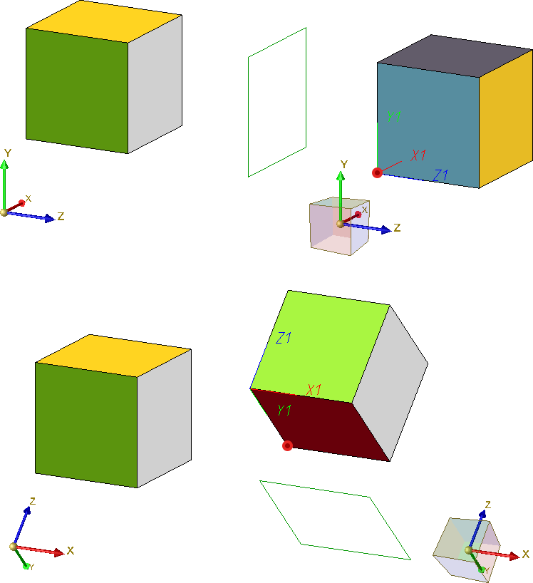- Durch die Definition einer Bearbeitungsebene lässt sich die Lage der Kopie auch steuern. Ist beim Einfügen des Teils eine Bearbeitungsebene aktiv, dann wird die Kopie so eingebaut, dass die xy-Ebene des Teilekoordinatensystems in oder parallel zu dieser Ebene liegt.