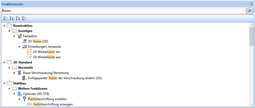 Wenn Sie im Andockfenster einen Suchbegriff eingeben, listet HiCAD alle Funktionen auf, deren Name den angegebenen Suchbegriff enthält. Gesucht wird dabei in allen Ribbon-Leisten sowie in den Funktionen des Andockfensters Bauwesenfunktionen.