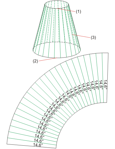 Diese Funktion wickelt die Oberfläche eines 3D-Teils (z. B. Kegelstumpf oder Freiformfläche) analytisch ab. Dabei wird immer eine Blechdicke (Offset) für die Schnitttiefe abgefragt. Bei gerundeten Flächen ergeben sich dadurch Änderungen im Flächeninhalt der Abwicklung.