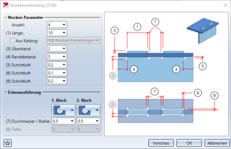 Haben Sie alle erforderlichen Daten eingegeben, dann kann die Nockenverbindung eingebaut werden. Bei Wahl von Vorschau wird die Nockenverbindung eingebaut, das Dialogfenster bleibt jedoch - im Unterschied zu OK - geöffnet. So können Sie die Daten ändern und mit Vorschau in der Zeichnung kontrollieren. Wenn Sie das Dialogfenster mit Abbrechen verlassen, wird die Funktion ohne Einbau bzw. ohne Änderung abgebrochen.