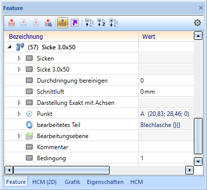Die Form wird in das Featureprotokoll des Blechteils eingetragen und kann mit einem Doppelklick auf den Eintrag z. B. Sicke 3.0x50 geändert werden.