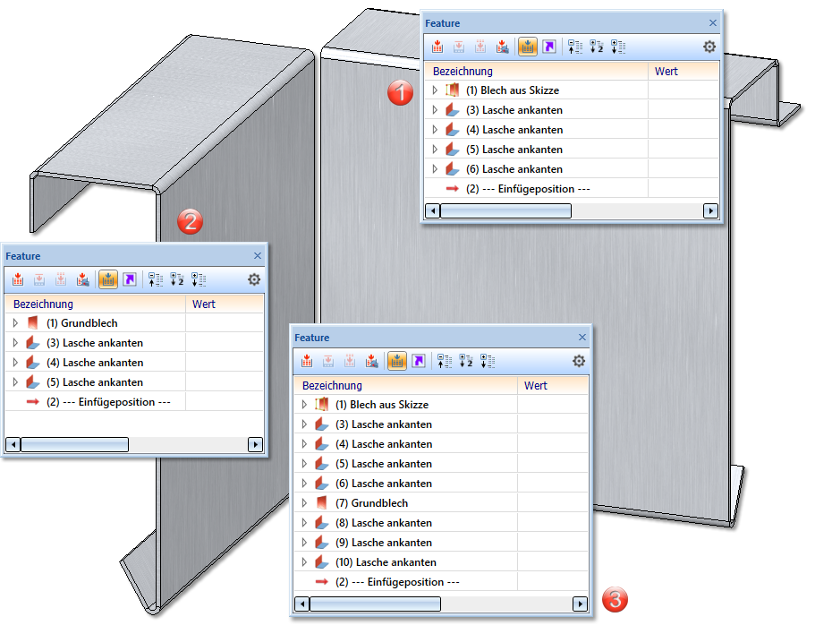 Das Featureprotokoll der hinzugefügten Bleche wird unter das Protokoll des aktiven Blechs gehängt. Das Erzeugungsfeature und die weiteren Featureschritte wie z. B. Lasche ankanten bleiben erhalten.