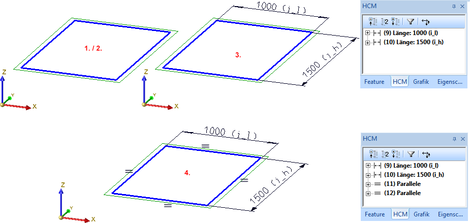 , z. B. Breite 1000, Höhe 1500. - Vergabe von Maßbedingungen für die Breite und Höhe mit der Funktion Skizze > HCM > Intelligente Bemaßung