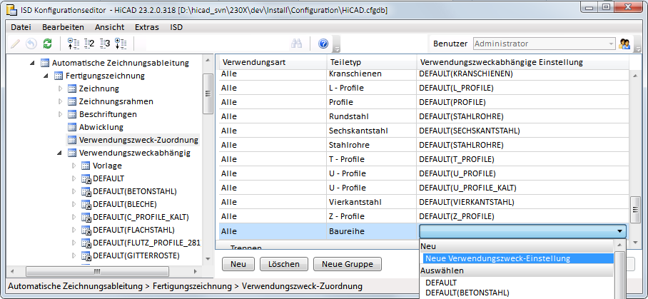 - Setzen Sie dort den Cursor unter Automatische Zeichnungsableitung > Fertigungszeichnung > Verwendungszweck-Zuordnung in die gewünschte Gruppe, z. B. Stahlbau