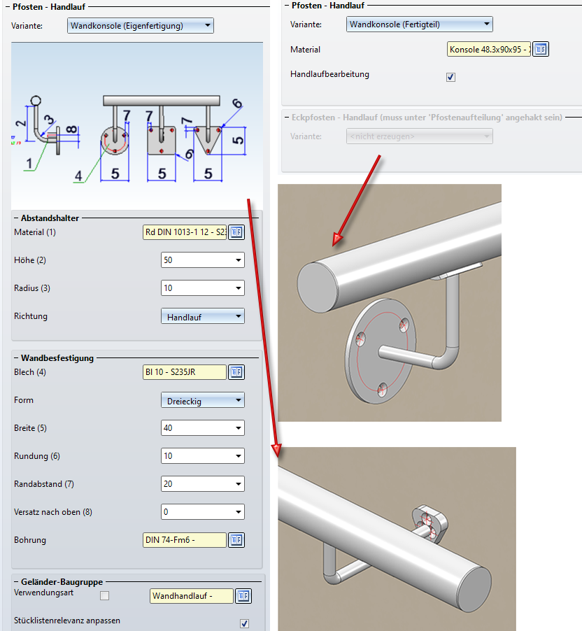 Mit dem Geländerkonfigurator lassen sich jetzt auch Handläufe mit Wandbefestigung erzeugen. Dazu ist die Registerkarte Pfosten - Handlauf um entsprechende Varianten erweitert worden.